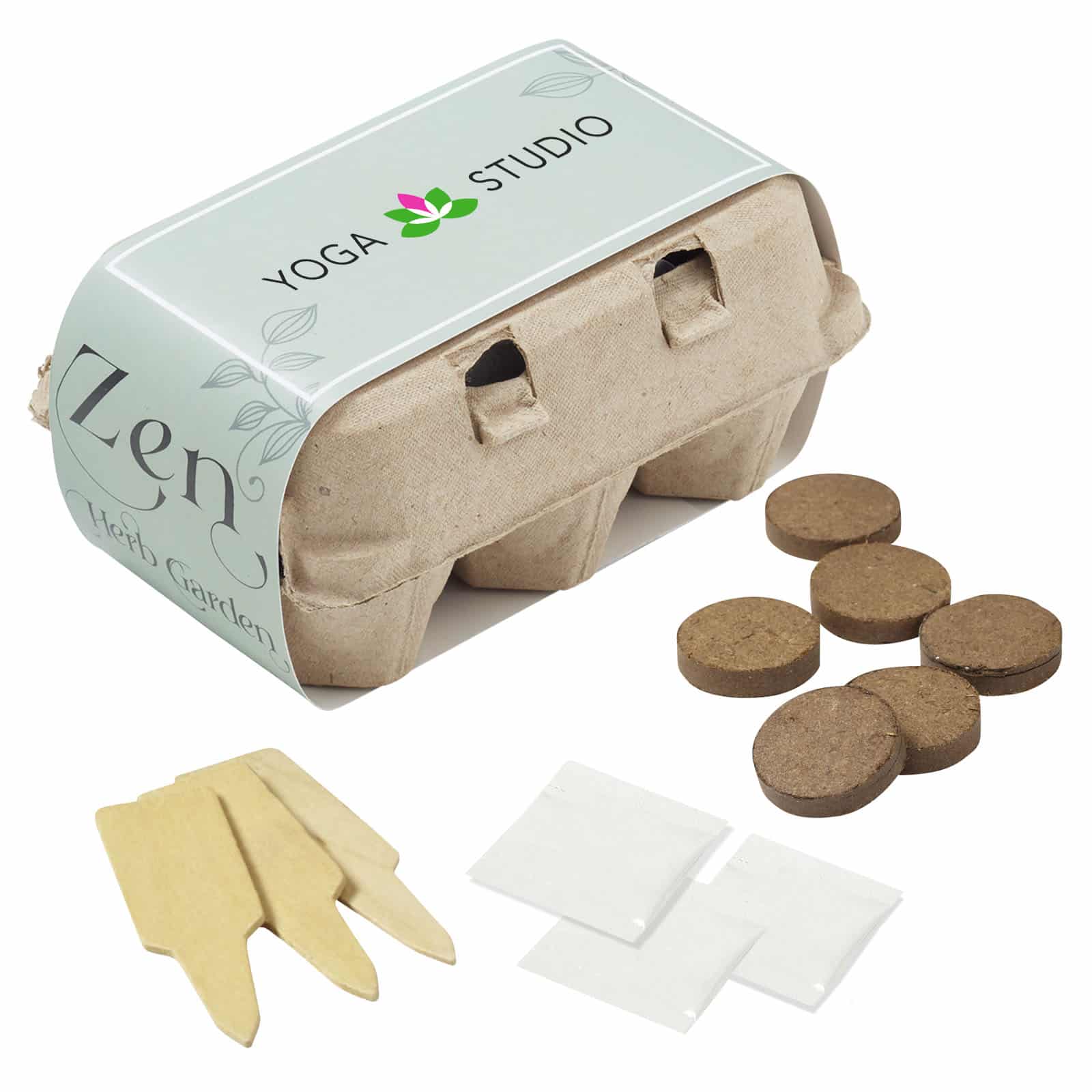 Grow-Your-Own Zen Garden Kit contain 3 packages of seeds and starter soil, plus wooden plant stakes, all inside a recycled 6 count egg carton! Write on the wooden stakes, to identify the seed type in each compartment! Use our stock design belly band and add your logo for a fantastic representation of your brand or create your own with our custom option. Seeds include: Lemon Balm, Lavender, and Chamomile. NOTE: • It is the customer’s responsibility to check whether this product can be imported into their chosen delivery country. Complies with Prop 65. 3″ D x 6.5″ W x 4″ H
