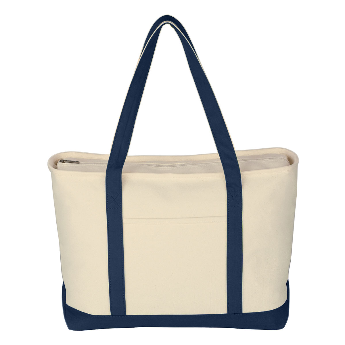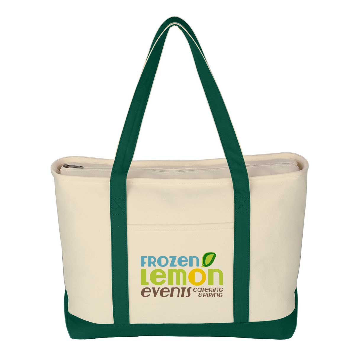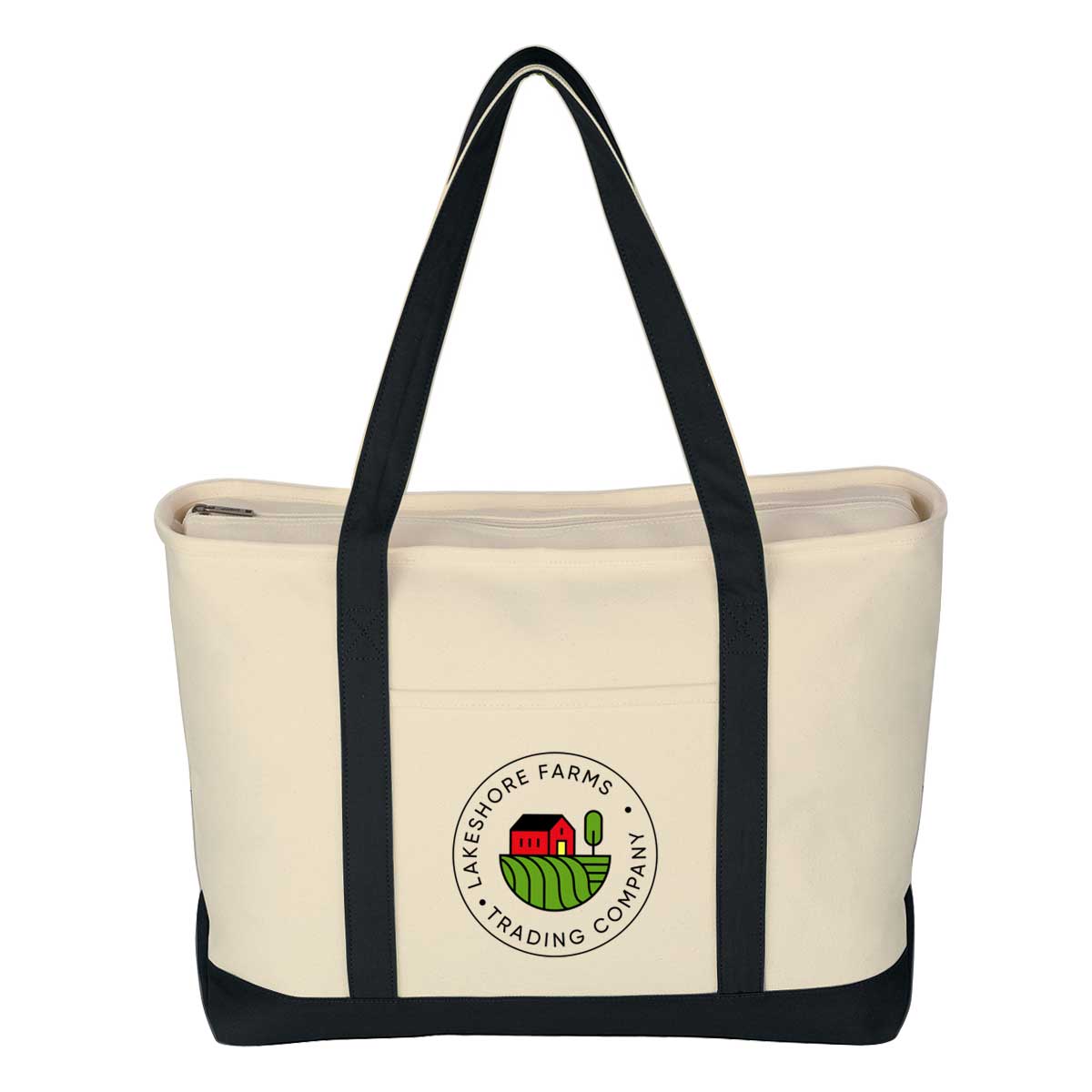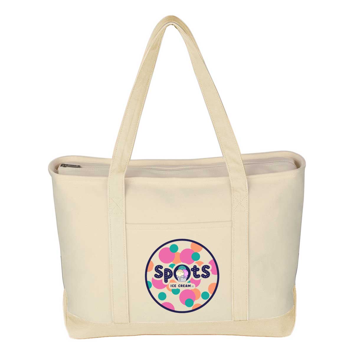 Give clients a tote they’ll actually use. With heavyweight cotton canvas and plenty of room, this bag carries their essentials and your logo with equal confidence. Comes with full color imprint.This bag is made of 24 oz cotton canvas and features a top zippered closure, 30-inch handles, a front pocket, and is easy to clean with spot cleaning and air drying. 23″ W x 14″ H x 7″ D