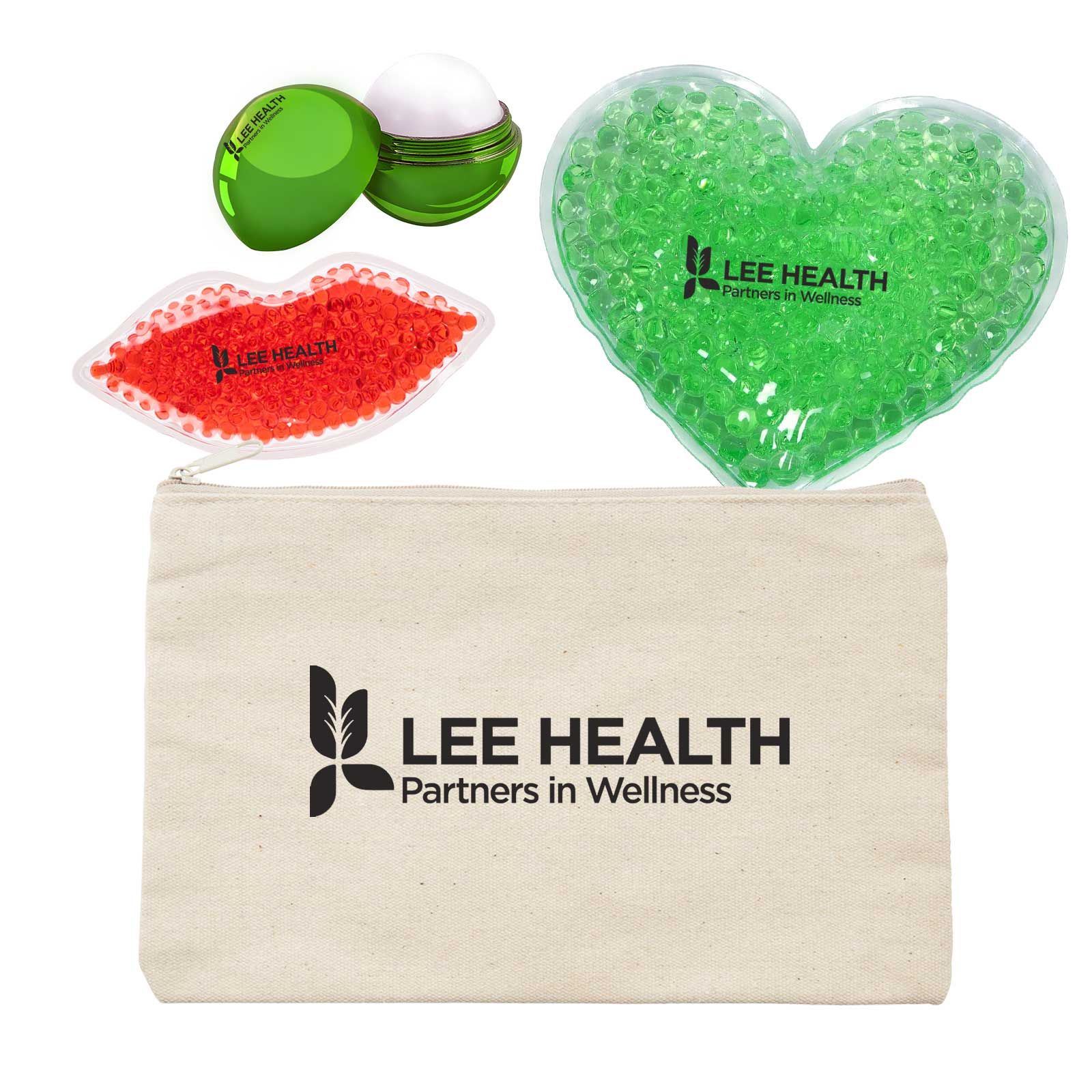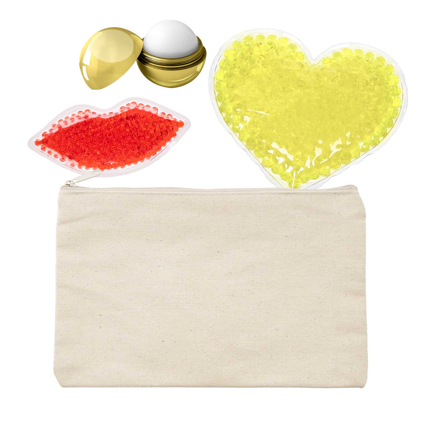 Indulge in a luxurious mini getaway with our charming spa kit! This delightful set features a chic canvas pouch, a heart-shaped gel pack for calming relaxation, a lip-shaped gel pack for a playful twist, and a round lip balm to keep your lips soft and supple. The perfect addition to your brand, spreading love and self-care one pampering product at a time!