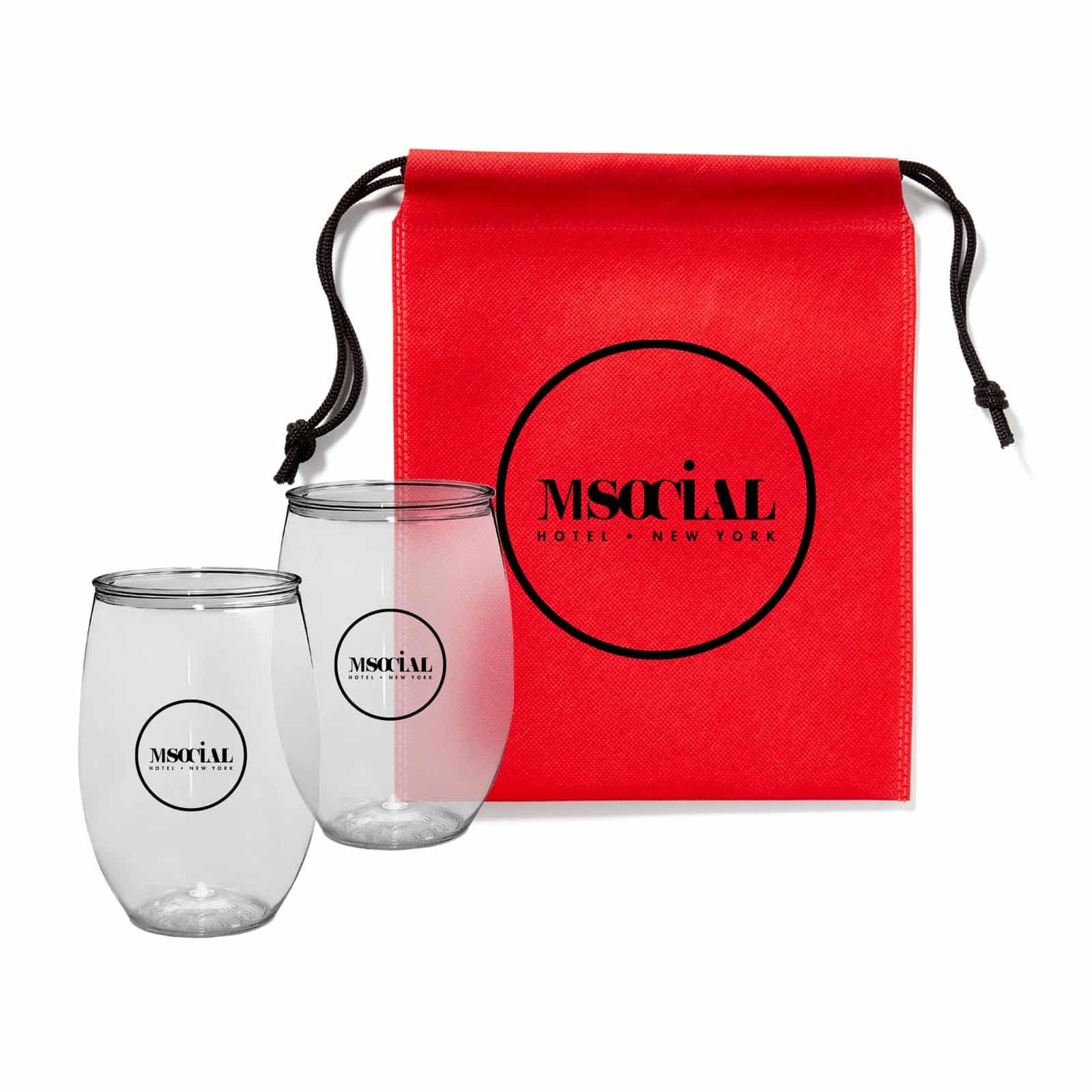 Toast the success of your brand with our Wine Tumbler Gift Set. Add your name, logo and marketing message before handing it out to your target audience for maximum brand exposure. Each set includes 2 pcs. of our PET 16oz. stemless wine glass (JK-5861) with a 1 color imprint on both cups packaged in a drawstring pouch (JK-0067). NOTE: All text on Non-Woven items must be a minimum of 1/3″ thick. Sans serif, block style font is recommended to achieve best imprint. Please avoid fine lines. Please Note: If you purchase any Non-Woven blank items to imprint yourself, Special Care Must Be Taken By You. EXCESSIVE HEAT WILL DAMAGE THE ITEM.