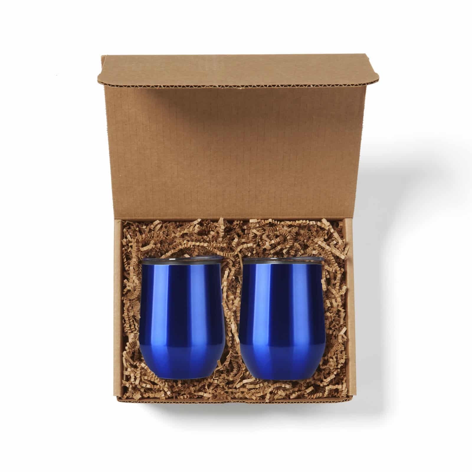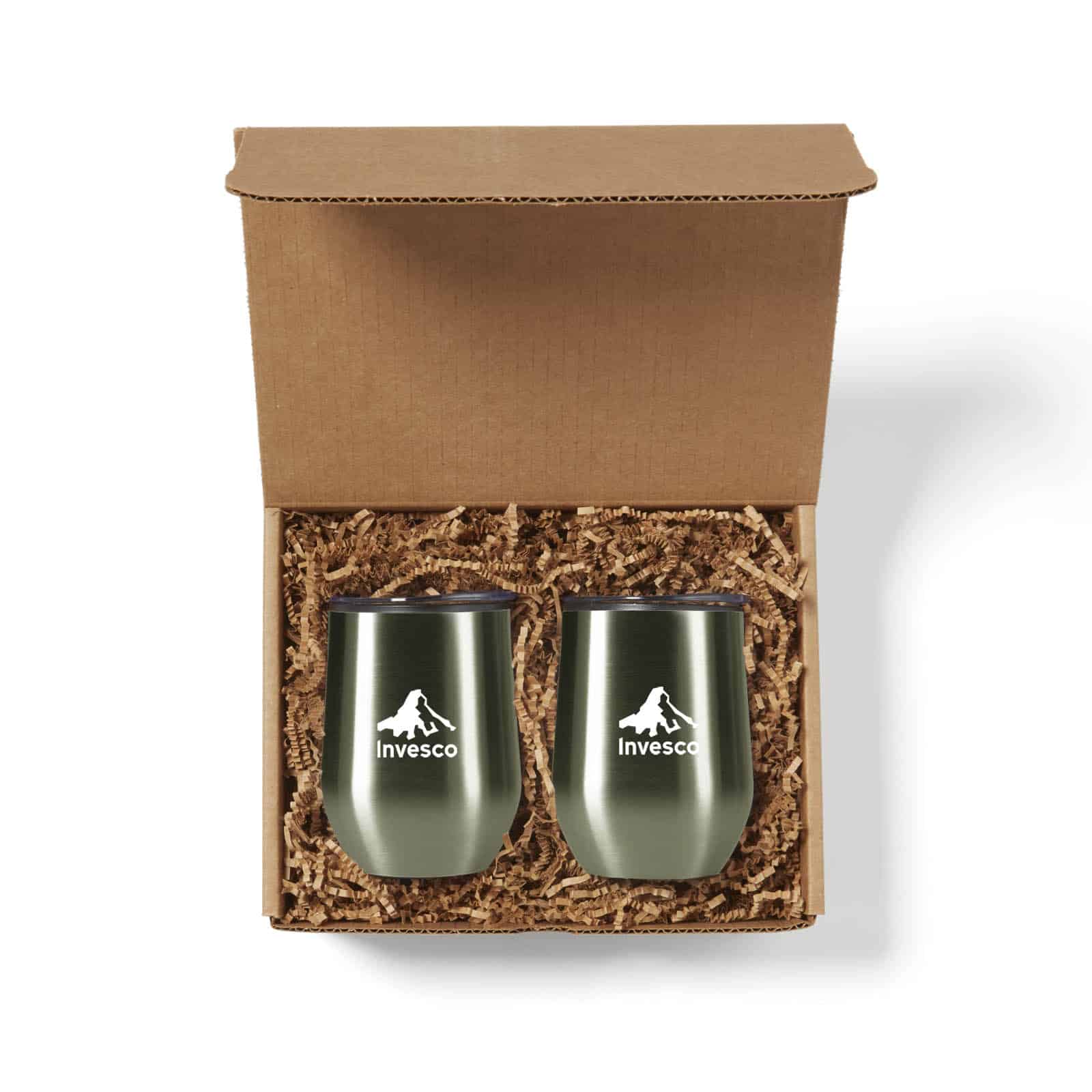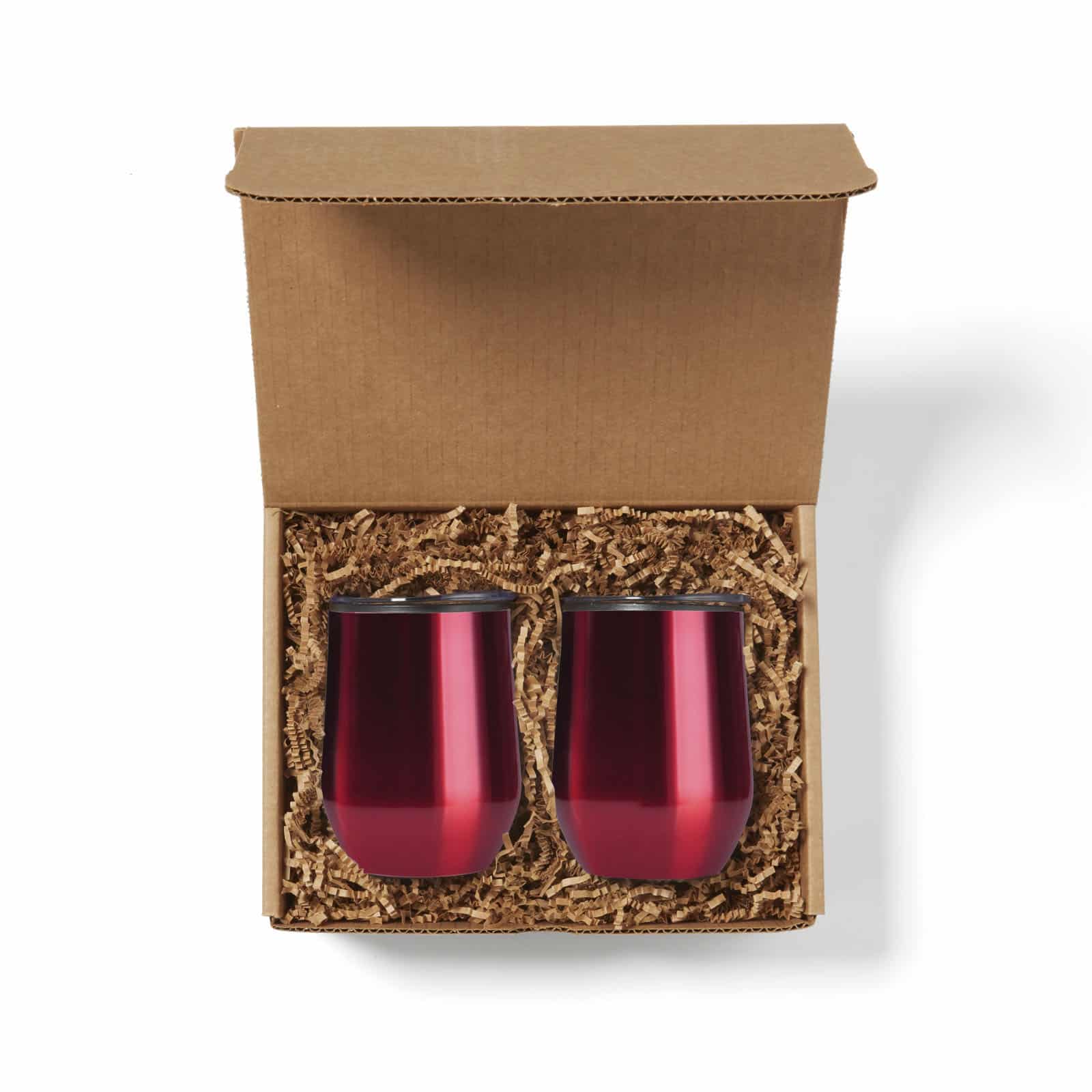 Drink to the success of your business or brand with these wine tumbler gift sets. This set of two 5″ x 3.25″ tumblers are made of stainless steel with polypropylene liners and a 12 ounce capacity. Includes a Kraft gift box with a natural tone shredded paper fill. Quench your thirst for exposure and publicity with this dynamic duo. Available in a variety of colors. 5″ H x 3.25″ Diameter